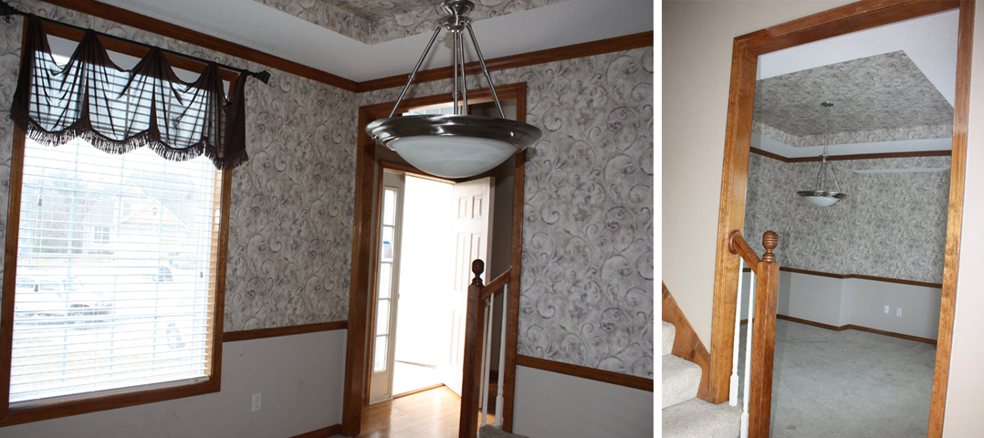 OMG…ugliest room ever. What were they thinking with that wallpaper?!Then with a little paint, paintable wallpaper for the tray ceiling, newly sewed curtains and our existing furniture/accessories, we turned it into this for under $150:
