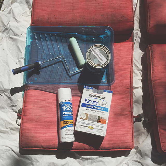 I had a plan and I knew what I needed to make it happen. I even painted our old, faded red chair cushions to a light aqua grey. Get the complete tutorial here. 🙂