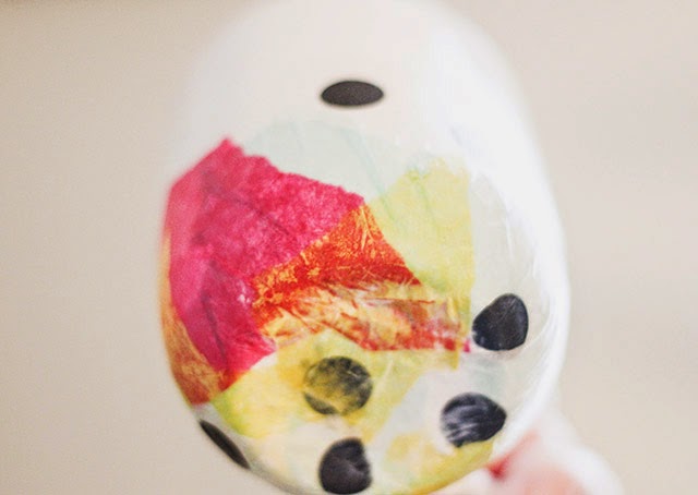 Simply rip of small imperfect pieces of tissue paper, and use your foam brush to apply the base coat of Mod Podge.