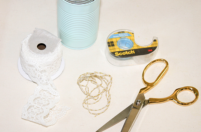 What a cute way to recycle. I love the blue can with the lace and twine!