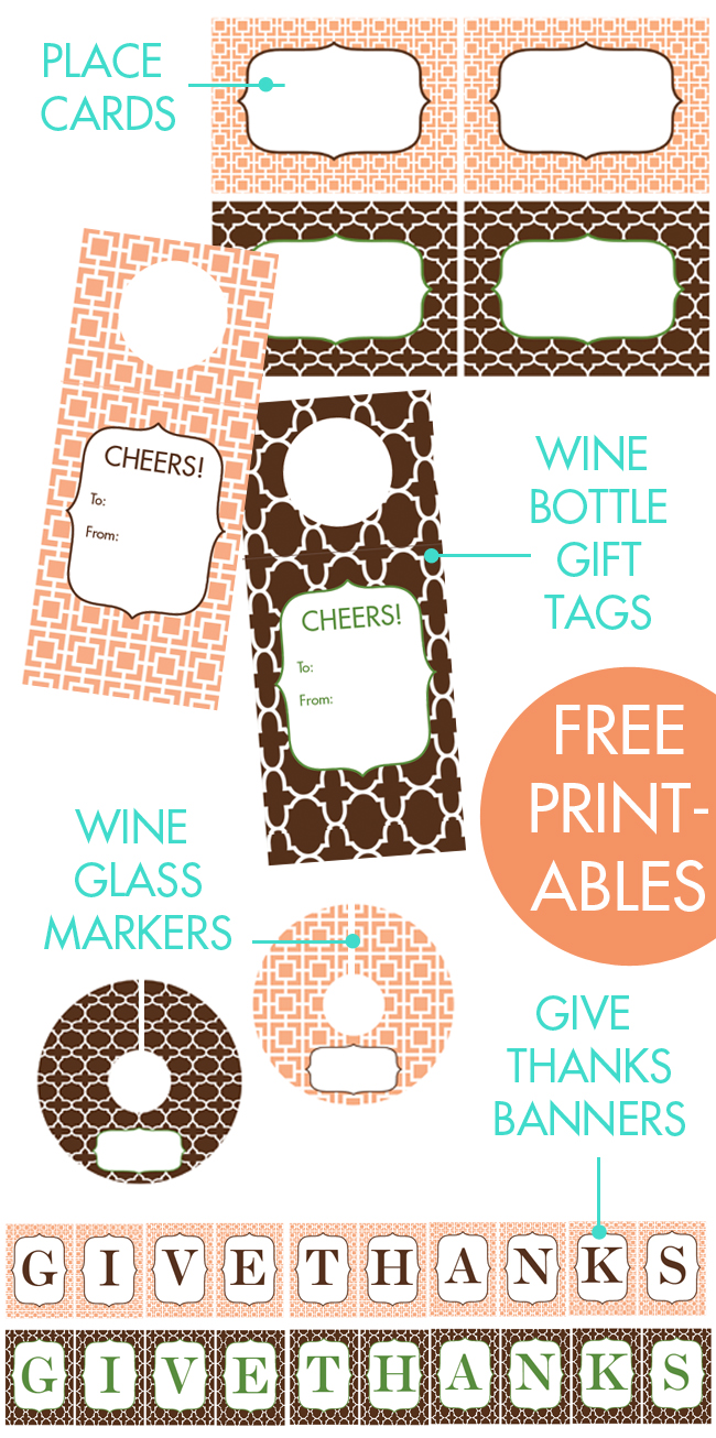 To help you add those special touches, I have designed coordinating, fall toned printable place cards, wine bottle markers, wine bottle gift tags and a “give thanks” banner that will help make the big day feel more personalized. There are 2 patterns and color palettes to choose from.