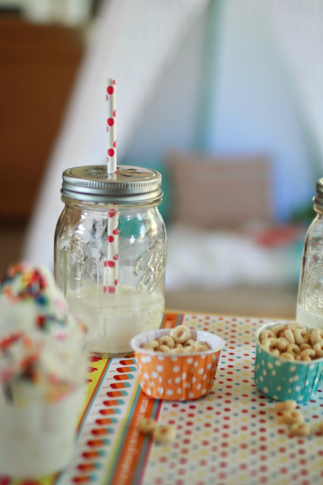 I set up a little kiddie table with adorable placemats, paper straws, gift bags and paper cups from Outside the Box Papers, and added some snacks including sprinkled ice cream (of course), Cheerios, rock candy and milk.